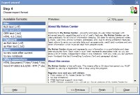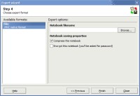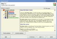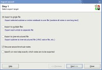 This is the final step of notes exporting. The list of possible export targets is displayed at the left pane. For single file exporting you may choose to save the text to RTF, Plain text (TXT), or HTML file, put the text to clipboard, create a new note in current or new notebook and put the text into that note or to save the text using installed MS Office Text Converters. The right pane shows you the preview of the text combined from exported notes.