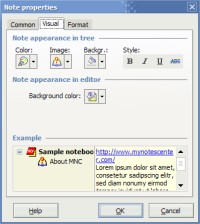 The Visual page is mostly the same as in notebook Visual properties plus it allows to choose background color for current note.