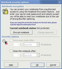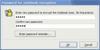 My Notes Center uses strong encryption algorithm named 'BlowFish'. It is symmethric and has a 448-bit key. Also My Notes Center uses an MD5 hash algorithm for user key checking purposes. My Notes Center does NOT store your key in notebook file and truly encrypts all your notes. To protect current notebook from unauthorized access press Encrypt notebook button. You will be asked for password and password reminder and than your notebook will be encrypted. Note, it is very important to enter a password reminder because if you forget your password it will be impossible to decrypt your notes. There's no backdoors.