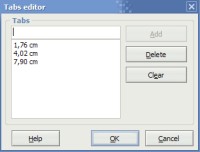 The tabs editor dialog allows you to edit the tabulation positions for current paragraph. Tabs are measured in centimeters or inches from the left edge of the paragraph. Also tab positions may be adjusted with the screen ruler.